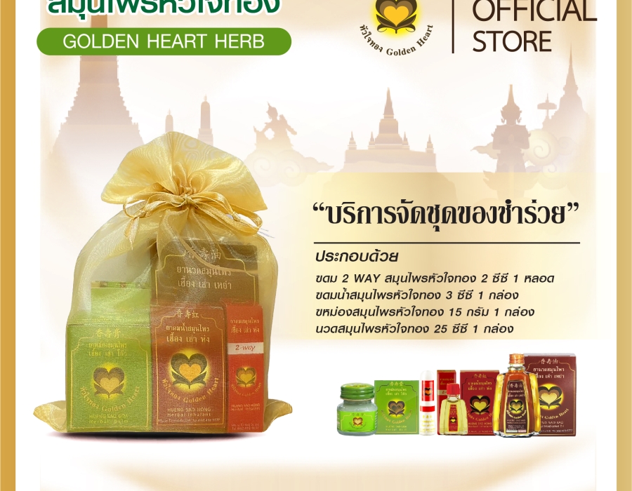 ยาสมุนไพรหัวใจทอง ชุดถุงทอง ราคา 195บาท บริษัท ที.เจ. เฮิร์บ จำกัด ผู้ผลิต ยาสมุนไพร "หัวใจทอง" ยาดมสมุนไพรหัวใจทอง ยานวดสมุนไพรหัวใจทอง และยาหม่องสมุนไพรหัวใจทอง ปรุงจากตำรับยาสมัยราชวงศ์ชิง ตำรับยาจีน "เฮื้อง เส่า" เป็นตำรับยาจีนโบราณ สืบทอดกันมากว่า 200 ปี ตัวยาใช้สมุนไพรจีนมากกว่า 20 ชนิด สมุนไพรหัวใจทอง ชุดถุงทอง ประกอบไปด้วย ยาดมสมุนไพรหัวใจทอง หลอด 2-way 2 ซีซี จำนวน 1 หลอด ยาดมน้ำสมุนไพรหัวใจทอง 3 ซีซี จำนวน 1 ขวด ยาหม่องสมุนไพรหัวใจทอง 15 กรัม จำนวน 1 ขวด ยานวด 25 ซีซี 1 ขวด