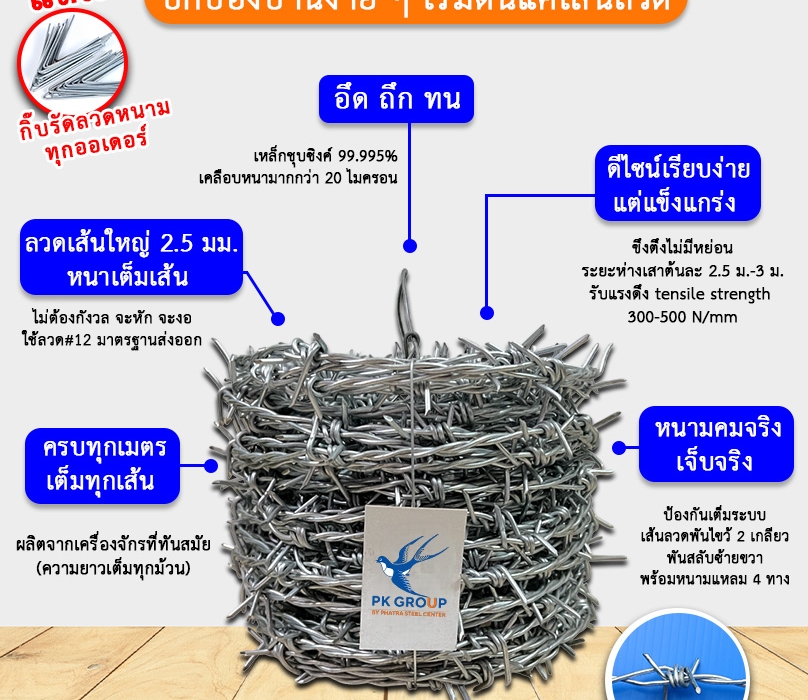 หนามคมแข็งแรง: ผลิตจากเหล็กคุณภาพสูง หนามคมแน่น ทนทานต่อแรงตัดและแรงงอ